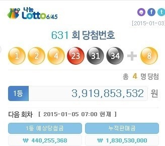 지난 3일 저녁 추첨한 로또 631회 당첨번호는 1, 2, 4, 23, 31, 34번으로 결정 됐다. 보너스 번호는 8번이다.