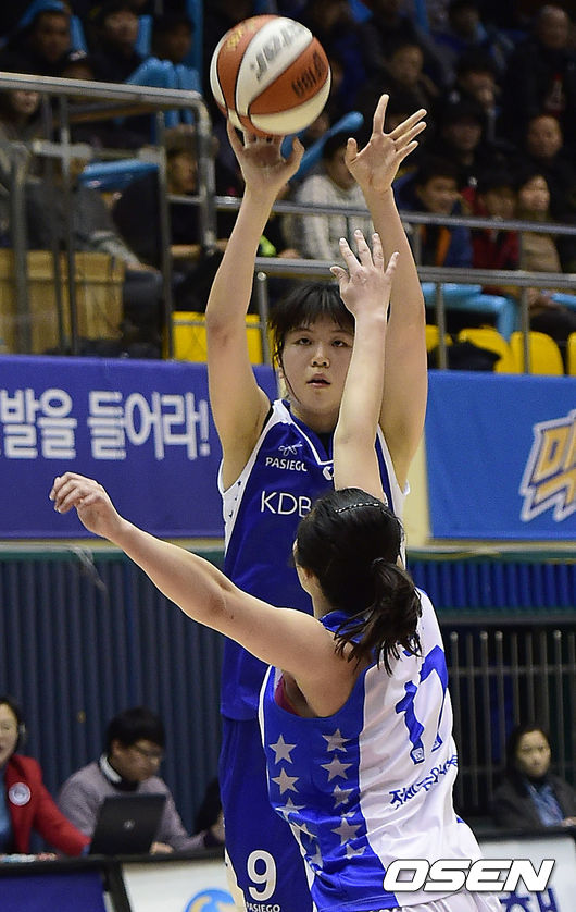 5일 오후 경기도 구리시체육관에서 열린 'KB국민은행 2014-2015 여자프로농구' KDB 생명과 우리은행의 경기, 2쿼터 KDB생명 김소담이 우리은행 김단비의 수비를 피해 슛을 시도하고 있다.