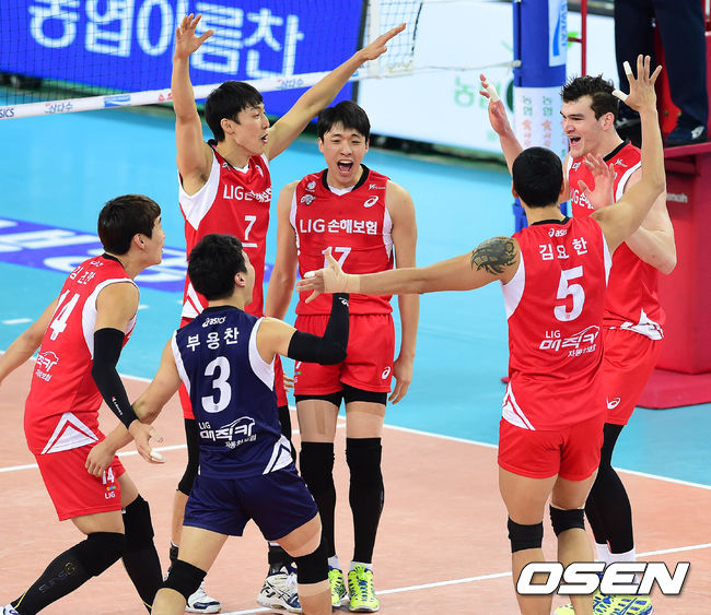 5일 오후 인천 계양체육관에서 열린 '2014-2015 NH농협 V-리그' 대한항공과 LIG 손해보험의 경기 1세트 LIG 손해보험 선수들이 득점 후 기뻐하고 있다.