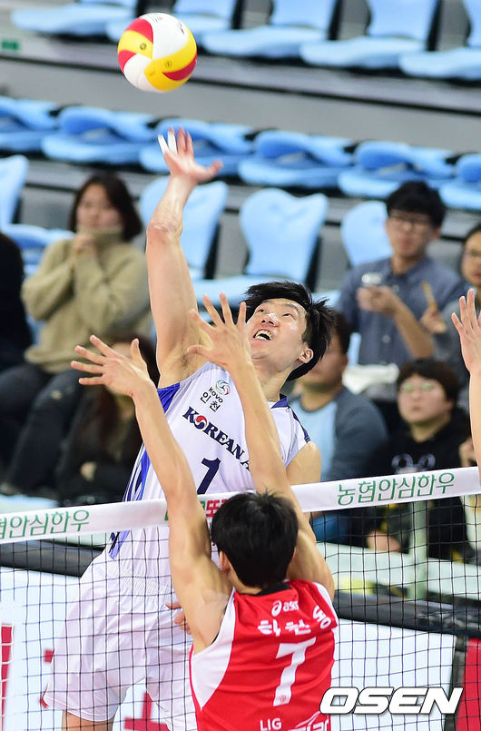 5일 오후 인천 계양체육관에서 열린 '2014-2015 NH농협 V-리그' 대한항공과 LIG 손해보험의 경기 1세트 신영수가 공격을 시도하고 있다.