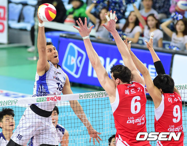 5일 오후 인천 계양체육관에서 열린 '2014-2015 NH농협 V-리그' 대한항공과 LIG 손해보험의 경기 1세트 산체스가 공격을 시도하고 있다.