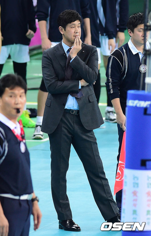 5일 오후 인천 계양체육관에서 열린 '2014-2015 NH농협 V-리그' 대한항공과 LIG 손해보험의 경기 1세트 김종민 감독이 경기를 지켜보고 있다.