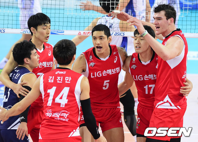 5일 오후 인천 계양체육관에서 열린 '2014-2015 NH농협 V-리그' 대한항공과 LIG 손해보험의 경기 1세트 LIG 손해보험 선수들이 득점 후 기뻐하고 있다.