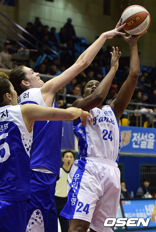 5일 오후 경기도 구리시체육관에서 열린 'KB국민은행 2014-2015 여자프로농구' KDB 생명과 우리은행의 경기, 3쿼터 우리은행 휴스턴의 슛을 KDB생명 테일러가 수비하고 있다.