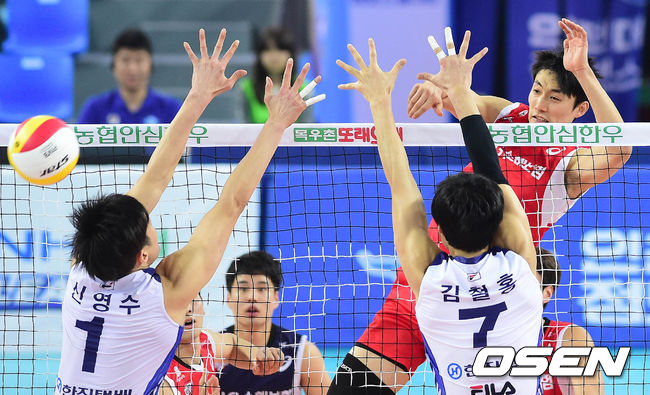 5일 오후 인천 계양체육관에서 열린 '2014-2015 NH농협 V-리그' 대한항공과 LIG 손해보험의 경기 2세트 하현용이 공격을 시도하고 있다.