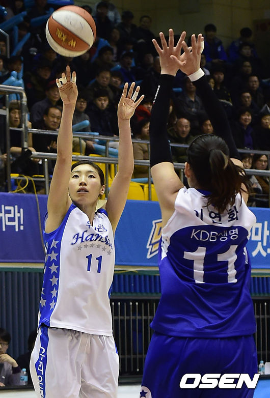 5일 오후 경기도 구리시체육관에서 열린 'KB국민은행 2014-2015 여자프로농구' KDB 생명과 우리은행의 경기, 3쿼터 우리은행 임영희가 KDB생명 이연화를 피해 슛을 시도하고 있다.