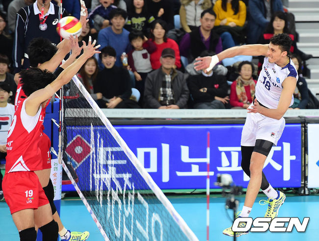 5일 오후 인천 계양체육관에서 열린 '2014-2015 NH농협 V-리그' 대한항공과 LIG 손해보험의 경기 4세트 산체스가 공격을 시도하고 있다.
