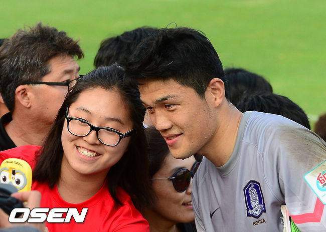 5일 오후 호주 시드니 매쿼리대학교 스포츠필드에서 열린 공개 훈련에서 훈련을 마친 후 정성룡이 팬과 함께 셀카를 찍고 있다.