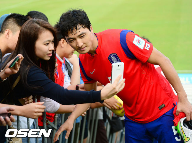 5일 오후 호주 시드니 매쿼리대학교 스포츠필드에서 열린 공개 훈련에서 훈련을 마친 후 곽태휘가 팬과 함께 셀카를 찍고 있다.