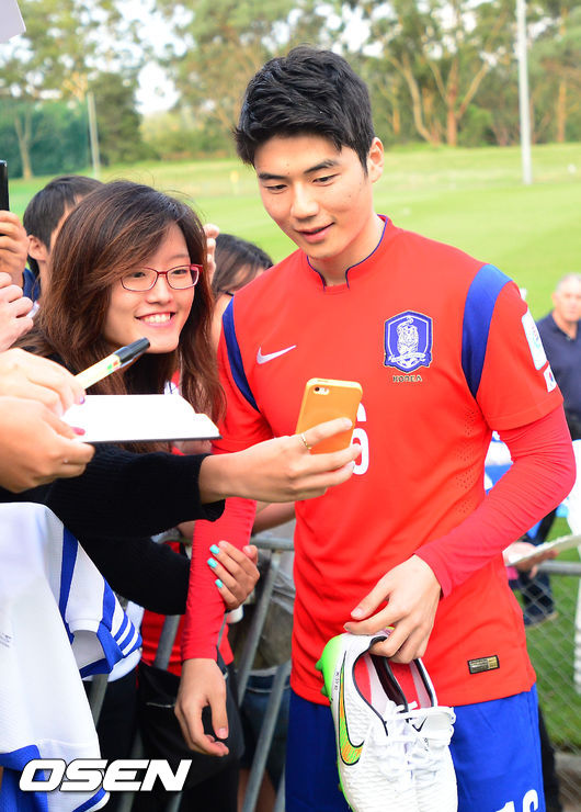 5일 오후 호주 시드니 매쿼리대학교 스포츠필드에서 열린 공개 훈련에서 훈련을 마친 후 기성용이 팬과 함께 셀카를 찍고 있다.