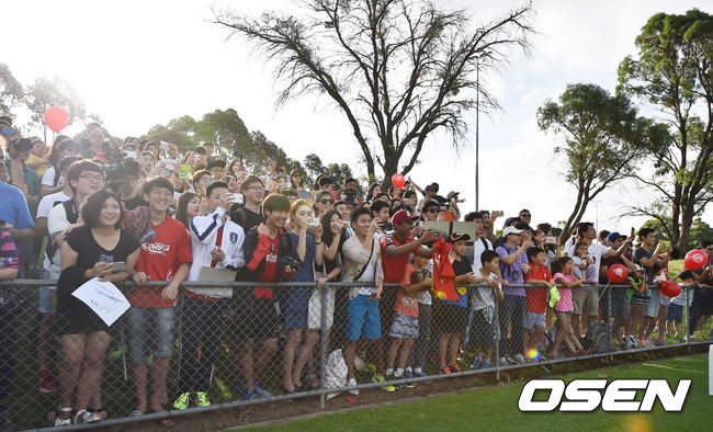 5일 오후 호주 시드니 매쿼리대학교 스포츠필드에서 열린 공개 훈련에서 교민 팬들이 환호하고 있다.