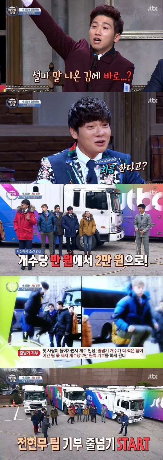 '비정상회담' 멤버들은 재미있게 실천하는 나눔 아이디어에 대한 대화를 나눴다. 장위안이 "내가 줄넘기를 잘하는데 줄넘기로 기부하면 좋을 것 같다"고 제안했다.