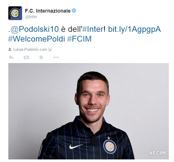 한편 인터 밀란 역시 공식 트위터를 통해 포돌스키의 입단을 알렸다. 인터밀란은 포돌스키에게 등번호 11번을 부여했다.