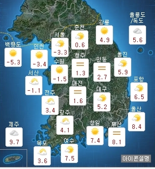 낮 최고기온은 영하 2도에서 영상 10도로 어제보다 낮으며, 미세먼지는 전 권역이 '보통' 수준을 유지할 예정이다.