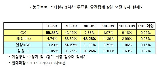 2014-15시즌 KBL 2경기 대상 농구토토 스페셜+ 3회차 투표율 중간집계 결과
