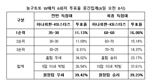 최종 하나외환 60점대-KB스타즈 60점대 16.08%로 최다 집계…7일(수) 오후 6시 50분 마감