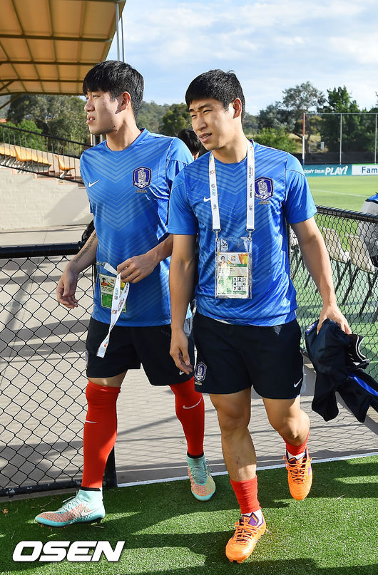 6일 오후 호주 캔버라 디킨 스타디움에서 열린 한국 축구대표팀 훈련에서 김주영과 이근호가 훈련장에 도착하고 있다.