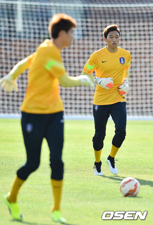 6일 오후 호주 캔버라 디킨 스타디움에서 열린 한국 축구대표팀 훈련에서 김진현과 김승규가 훈련장에 몸을 풀고 있다.
