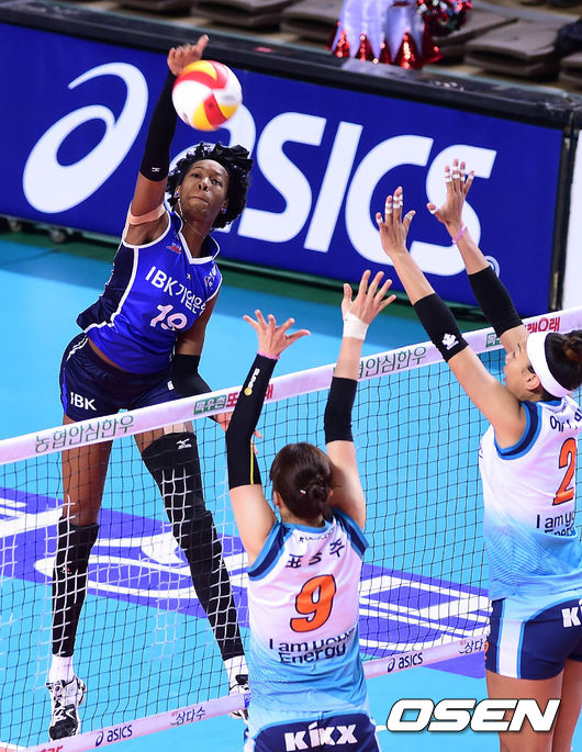 6일 오후 화성시 화성실내체육관에서 열린 '2014-2015 NH농협 V-리그' IBK기업은행과 GS칼텍스의 경기 1세트 데스티니가 공격을 시도하고 있다.