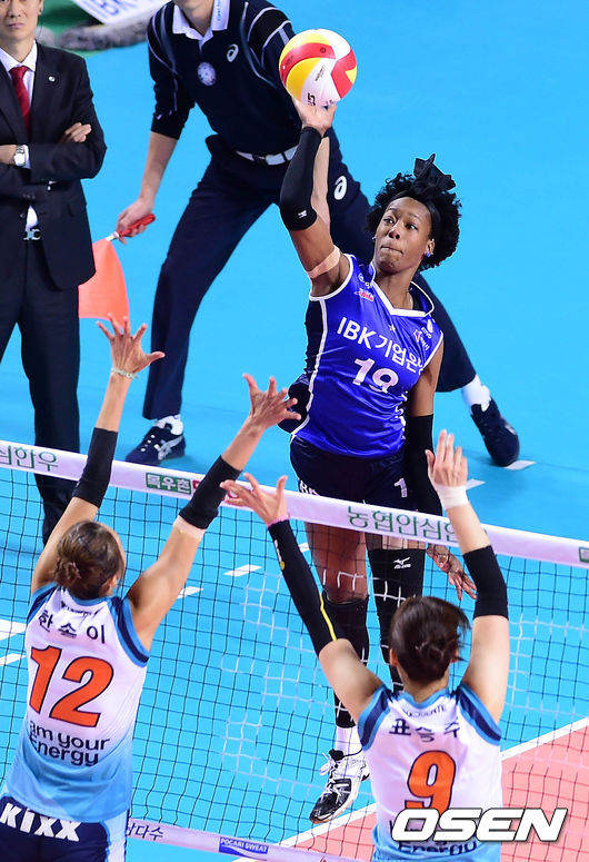 6일 오후 화성시 화성실내체육관에서 열린 '2014-2015 NH농협 V-리그' IBK기업은행과 GS칼텍스의 경기 1세트 데스티니가 공격을 시도하고 있다.