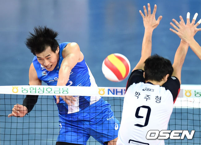 1세트 우리카드 김정환이 현대캐피탈의 블로킹 벽을 피해 공격을 시도하고 있다.
