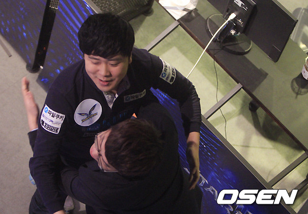 6일 서울 서초 강남 넥슨 아레나에서 'SK텔레콤 스타크래프트2 프로리그 2015시즌' 1라운드 3주차 삼성 갤럭시와 스타테일-요이(이하 ST요이)의 경기가 열렸다. ST요이 이원표가 2세트를 승리한 이후 이날 생일인 이선종 감독과 포옹으로 자신의 연패 탈출과 프로리그 첫 승을 기뻐하고 있다.