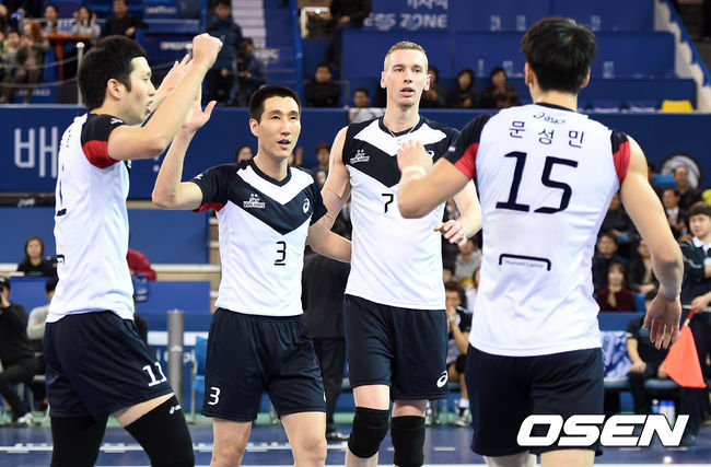 천안 현대캐피탈 스카이워커스는 6일 천안 유관순체육관에서 열린 2014-2015 NH농협 V-리그 남자부 아산 우리카드 한새와의 경기에서 3-0(25-17, 25-18, 25-21)으로 승리했다.