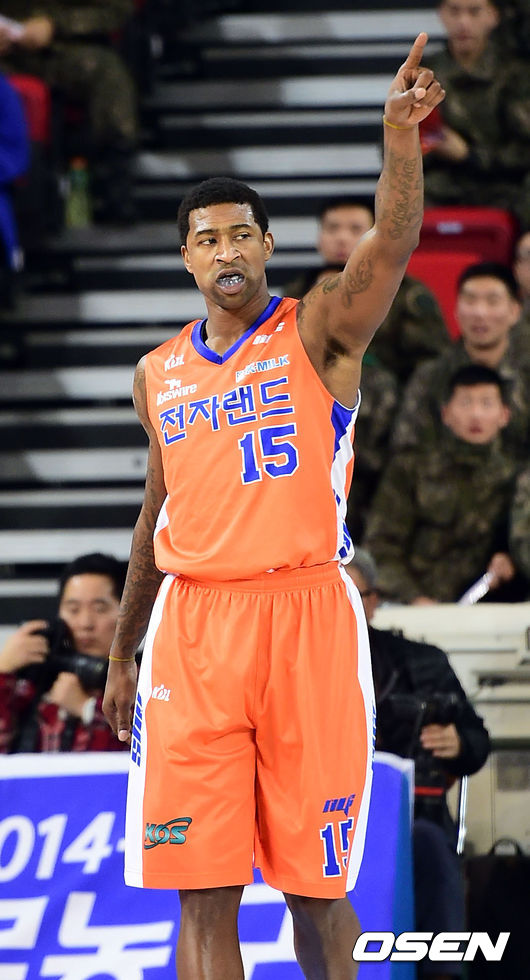 6일 오후 인천 삼산월드체육관서 열린 2014-2015 KCC 프로농구 정규리그 인천 전자랜드와 원주 동부의 경기, 4쿼터 포웰이 3점슛을 성공시킨후 팬들 향해 손가락을 보이고 있다.