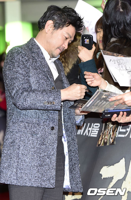6일 오후 서울 영등포 타임스퀘어에서 열린 영화 '강남 1970' 쇼케이스에서 배우 정진영이 팬서비스를 하고 있다.