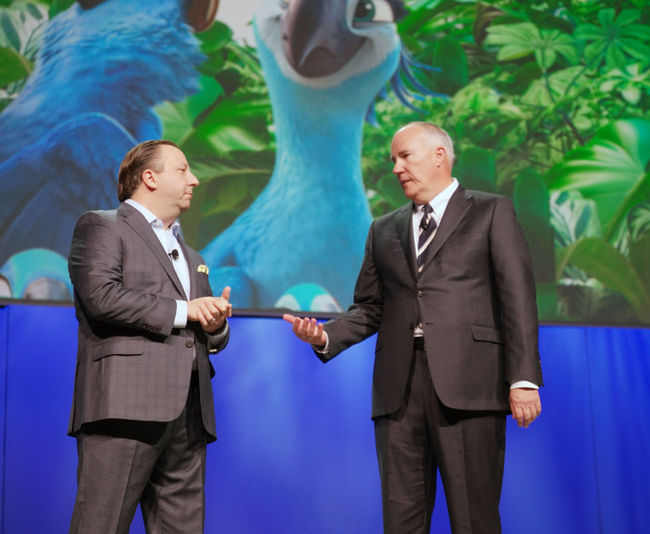 CES 2015 삼성전자 프레스 컨퍼런스에서 삼성전자 미국법인 조 스틴지아노 상무(왼쪽)와 20세기폭스 홈엔터테인먼트 부문의 마이크던 사장이 'UHD 얼라이언스'를 소개하는 모습. / 삼성전자 제공.