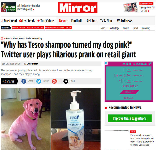 7일(이하 한국시간) 영국 매체 '미러'는 거대 유통업체인 테스코가 깜짝 놀란 사건을 보도했다. 이에 따르면 '아담'이라는 한 사람은 자신의 트위터를 통해 테스코에서 판매하는 샴푸를 사용했더니 개가 분홍색으로 바뀌었다는 내용과 함께 사진을 테스코 측에 전달했다.