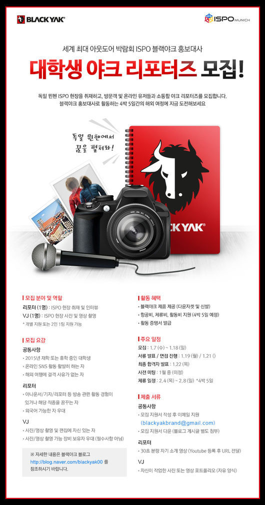 히말라얀 오리지널 아웃도어 브랜드 블랙야크(대표 강태선)가 오는 2월 5일부터 8일까지 독일 뮌헨에서 열리는 세계 최대 아웃도어 박람회 ISPO에서 블랙야크 홍보대사로 활동할 '대학생 야크리포터즈'를 모집한다.