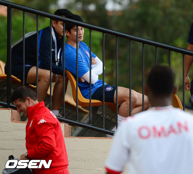7일 오후 호주 캔버라 디킨 스타디움에서 열린 한국 축구대표팀 훈련에서 기성용이 인터뷰를 기다리며 오만선수들의 퇴장을 기다리고 있다.