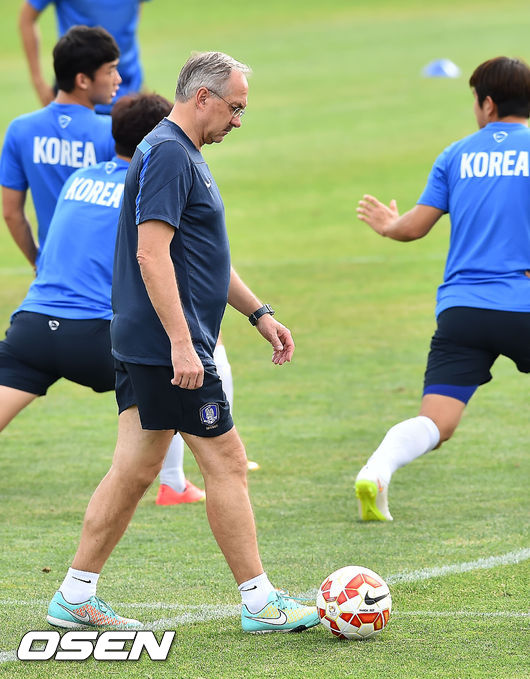 7일 오후 호주 캔버라 디킨 스타디움에서 열린 한국 축구대표팀 훈련에서 슈틸리케 감독이 공을 차며 생각에 잠겨있다.