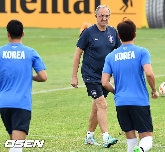 7일 오후 호주 캔버라 디킨 스타디움에서 열린 한국 축구대표팀 훈련에서 슈틸리케 감독이 선수들의 훈련을 바라보고 있다.