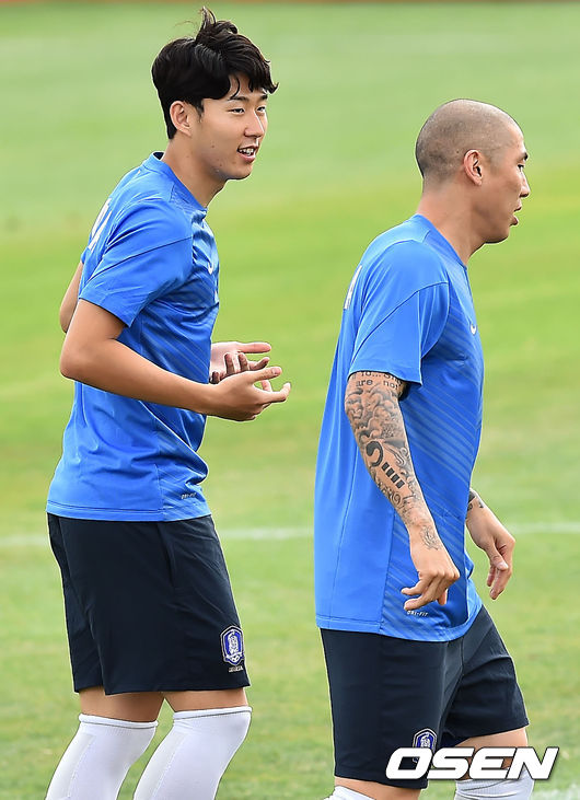7일 오후 호주 캔버라 디킨 스타디움에서 열린 한국 축구대표팀 훈련에서 차두리와 손흥민이 얘기를 나누고 있다.
