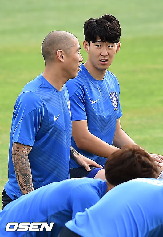 7일 오후 호주 캔버라 디킨 스타디움에서 열린 한국 축구대표팀 훈련에서 손흥민과 차두리 얘기를 나누고 있다.