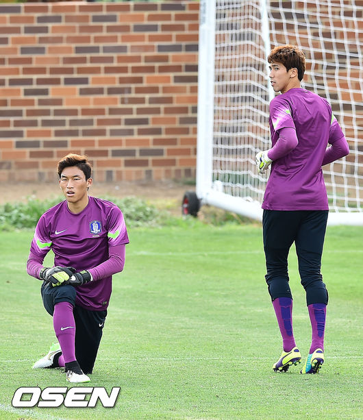 7일 오후 호주 캔버라 디킨 스타디움에서 열린 한국 축구대표팀 훈련에서 김승규와 김진현이 몸을 풀고 있다.