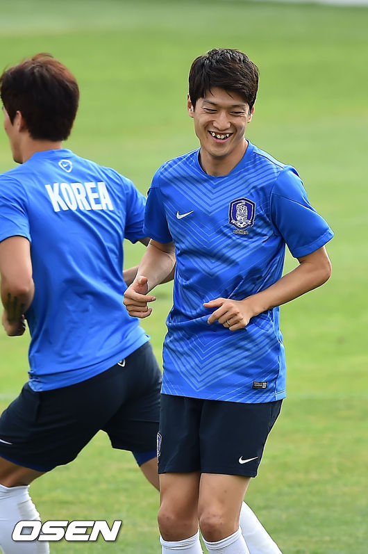 7일 오후 호주 캔버라 디킨 스타디움에서 열린 한국 축구대표팀 훈련에서 이청용이 몸을 풀며 환하게 웃고 있다.