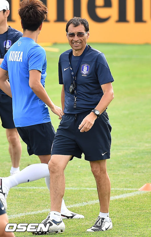 7일 오후 호주 캔버라 디킨 스타디움에서 열린 한국 축구대표팀 훈련에서 아르무아 코치가 환하게 웃고 있다.