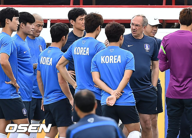 7일 오후 호주 캔버라 디킨 스타디움에서 열린 한국 축구대표팀 훈련에서 슈틸리케 감독이 선수들과 미팅을 갖고 있다.