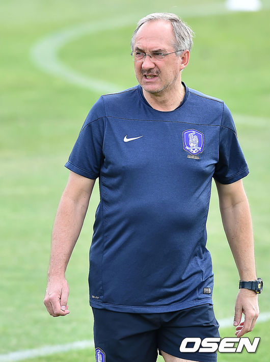7일 오후 호주 캔버라 디킨 스타디움에서 열린 한국 축구대표팀 훈련에서 슈틸리케 감독이 선수들에게 외치고 있다.