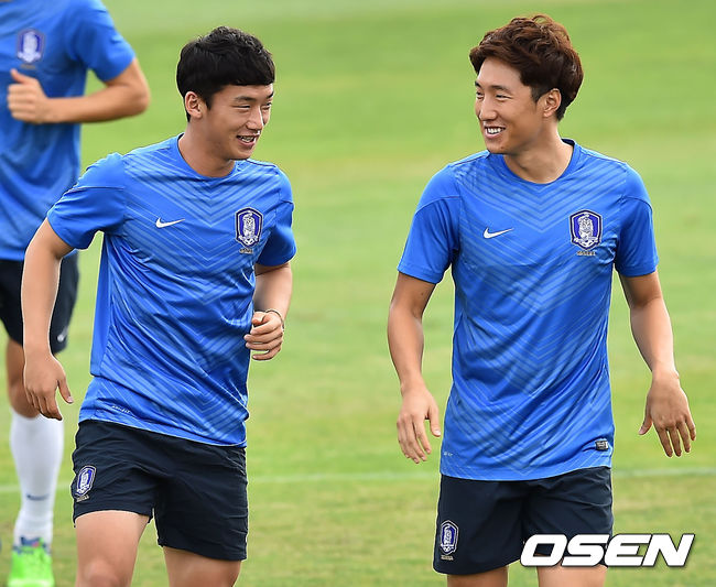 7일 오후 호주 캔버라 디킨 스타디움에서 열린 한국 축구대표팀 훈련에서 김민우 조영철이 훈련을 하며 환하게 웃고 있다.