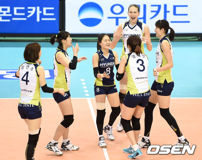 2세트 득점에 성공한 현대건설 선수들이 환호하고 있다.