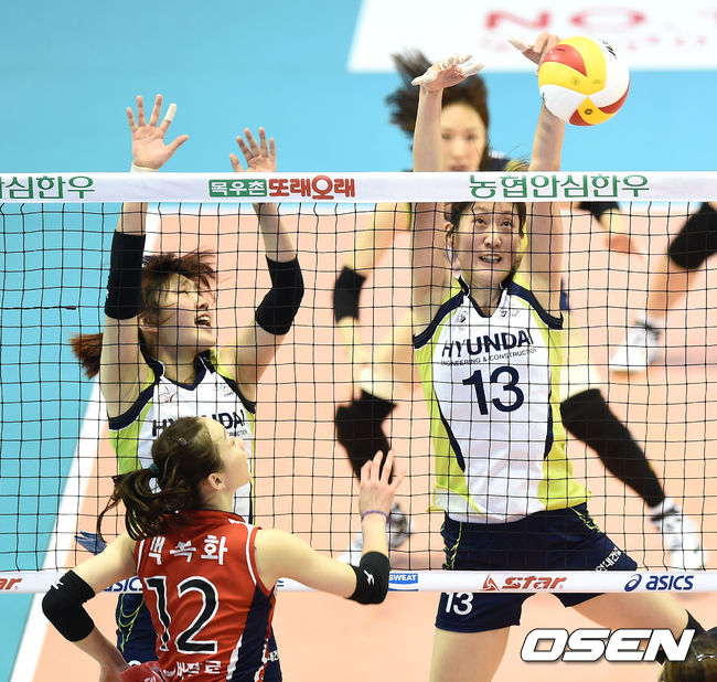 1세트 현대건설 유미라가 KGC인삼공사 백목화의 공격을 블로킹하고 있다.