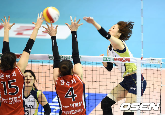 1세트 현대건설 황연주가 KGC인삼공사의 블로킹 벽을 피해 공격을 시도하고 있다.