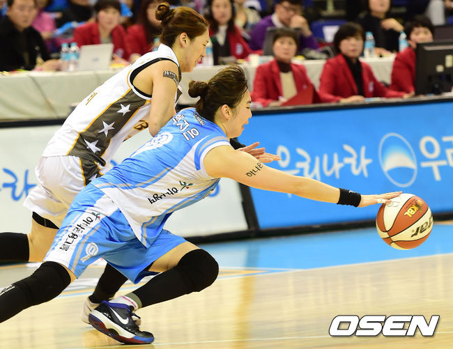 7일 오후 경기도 부천실내체육관에서 열린 'KB국민은행 2014-2015 여자프로농구' 하나외환과 KB스타즈의 경기 2쿼터, 하나외환 백지은이 루즈볼을 위해 몸을 날리고 있다.