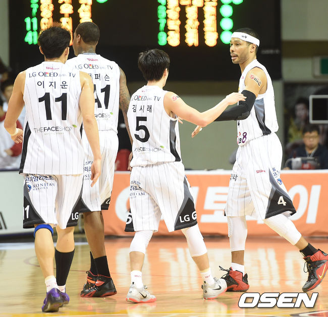 2쿼터, LG 문태종이 3점슛을 성공시킨 뒤 동료들과 인사를 나누고 있다.