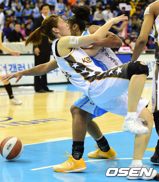7일 오후 경기도 부천실내체육관에서 열린 'KB국민은행 2014-2015 여자프로농구' 하나외환과 KB스타즈의 경기 2쿼터, 리바운드를 다투던 KB 스타즈 김민정과 하나외환 토마스가 충돌하고 있다.