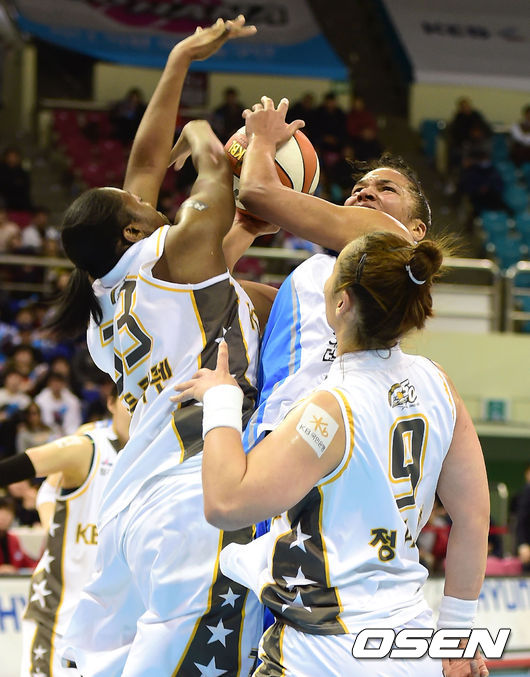 7일 오후 경기도 부천실내체육관에서 열린 'KB국민은행 2014-2015 여자프로농구' 하나외환과 KB스타즈의 경기 3쿼터, KB스타즈 스트릭렌이 하나외환 토마스의 슛을 블로킹 하고 있다.